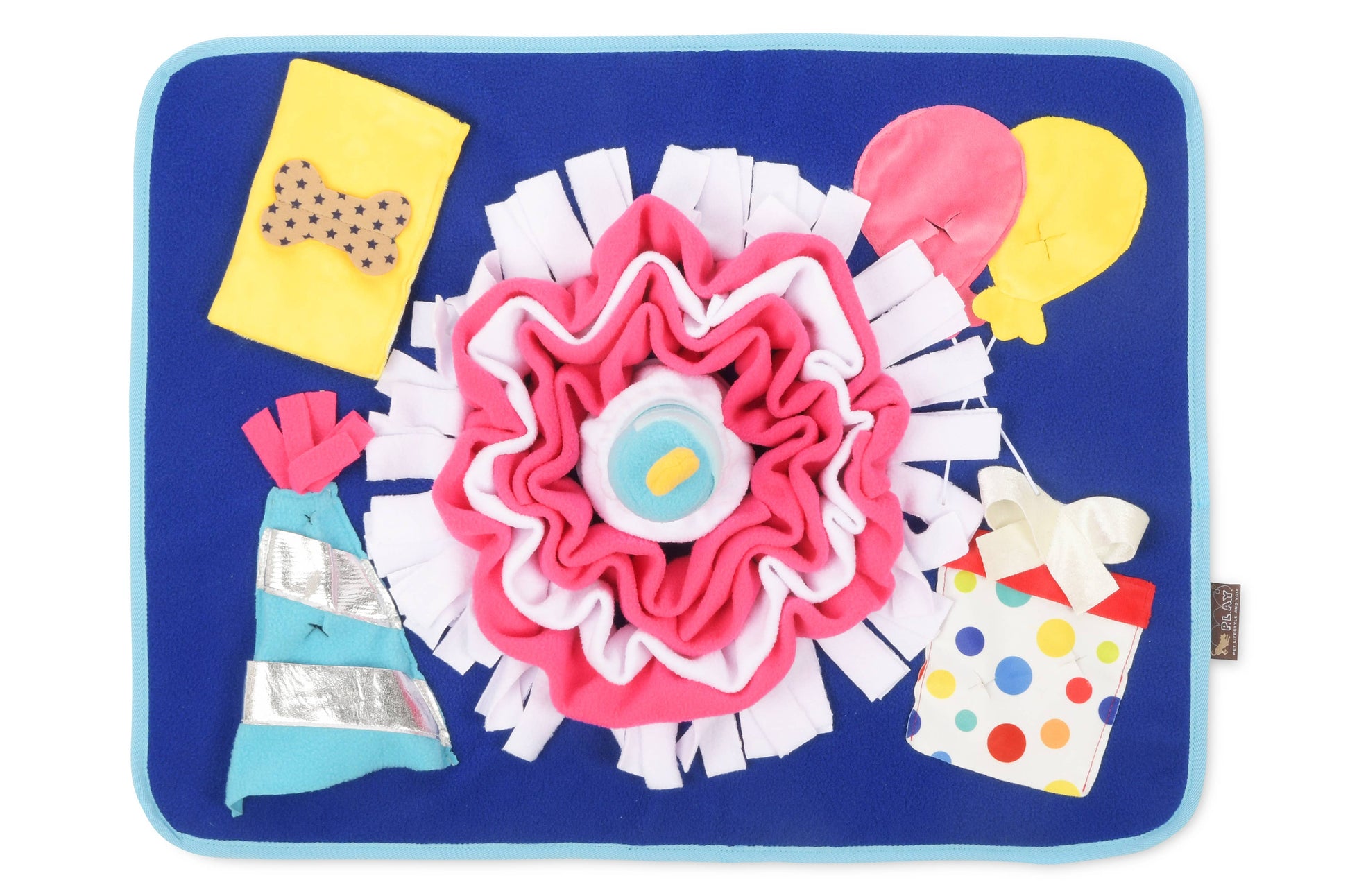 TBDMake every day a celebration with P.L.A.Y.'s Woof-day Celebration Snuffle Mat! This colorful and tail-wagging sensation is designed to add a touch of excitement and interactive enrichment to your pet's daily routine. Your pup will dive into a world of sniff-tastic adventure with hidden treats, engaging challenges and a squeaking candle.